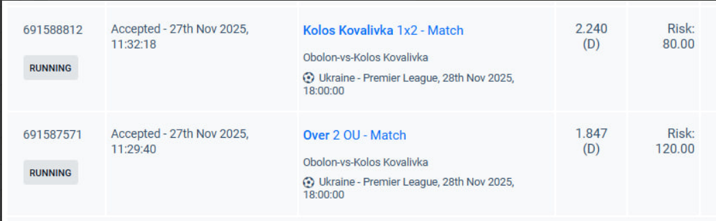 Впевнений у цьому матчі. Тому й дві ставки. Колос відійшов від кризи та показує непогану гру і однозначно впевненість після останніх 6 очок здобутих після вольової перемоги над Кудрівкою та доволі сенсаційної але заслуженої перемоги над Динамо. Оболонь навпаки - після хорошого старту в кризі. І таке враження, що вдома їм тяжче грати - всього 5 набраних очок і 10 на виїзді. На мою думку Колос має виграти за рахунок кращих гравців, командного настрою та впевненості. Але і Оболонь мусить атакувати. Тому очікую шось типу 1:2.