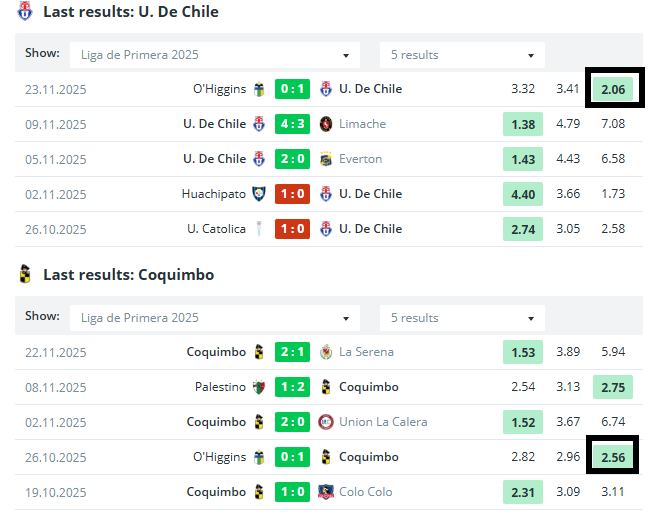 По- третє, Coquimbo Unido ціниться гірше ніж Universidad de Chile. Ось приклад: