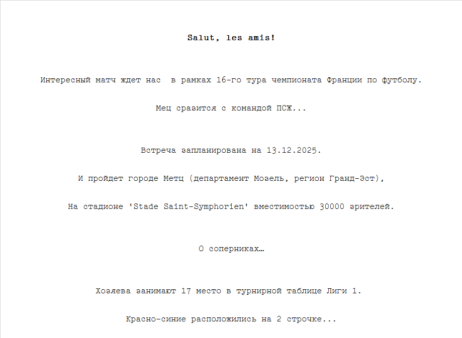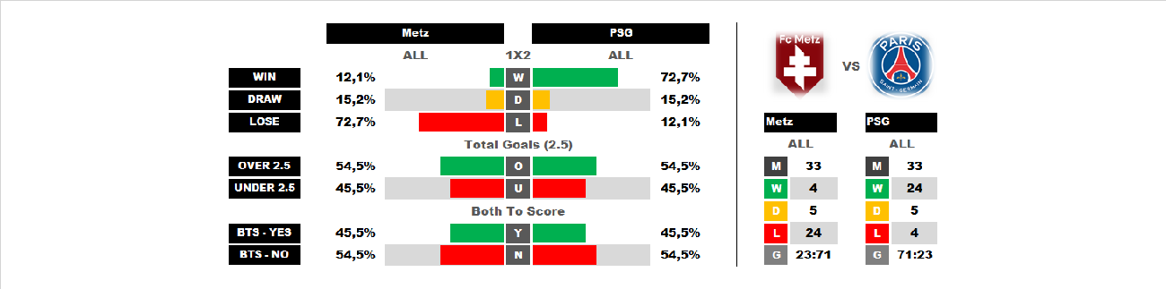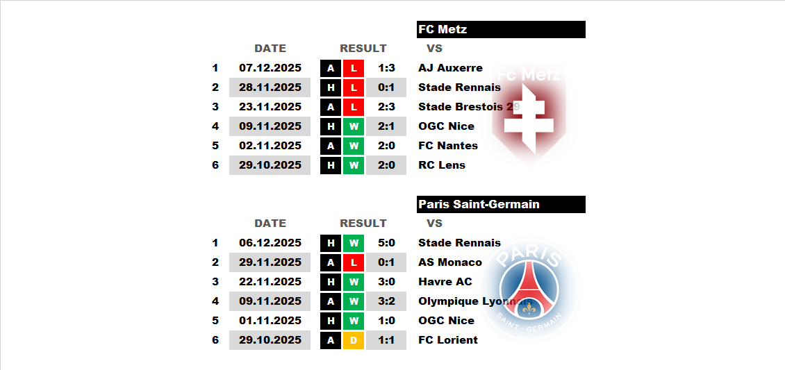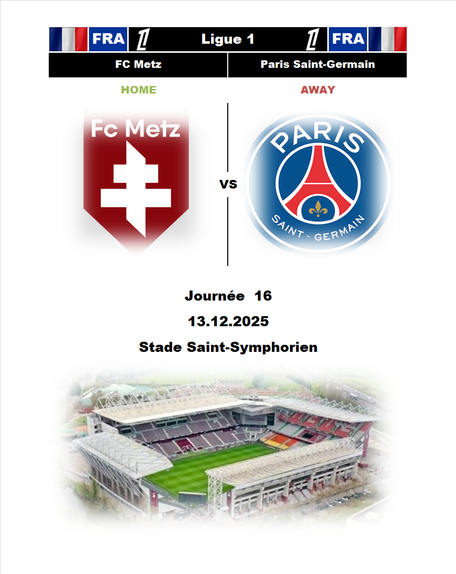BetTop-5 опубликовано 09.12.2025 20:34 Metz - Paris Saint-Germain 21:00 13.12.2025 Football France. Ligue 1. Paris Saint-Germain Ligue 1 Metz France 0 7