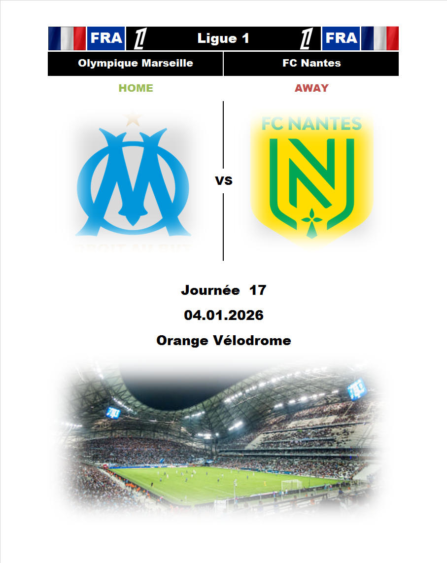 BetTop-5 опубликовано 31.12.2026 17:40 Marseille - Nantes 17:00 04.01.2026 Football France. Ligue 1. Ligue 1 Marseille Nantes France 0 2