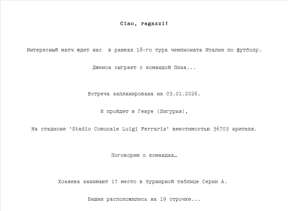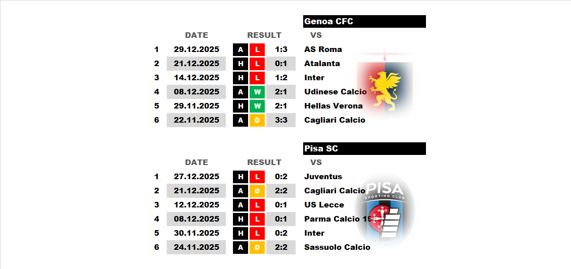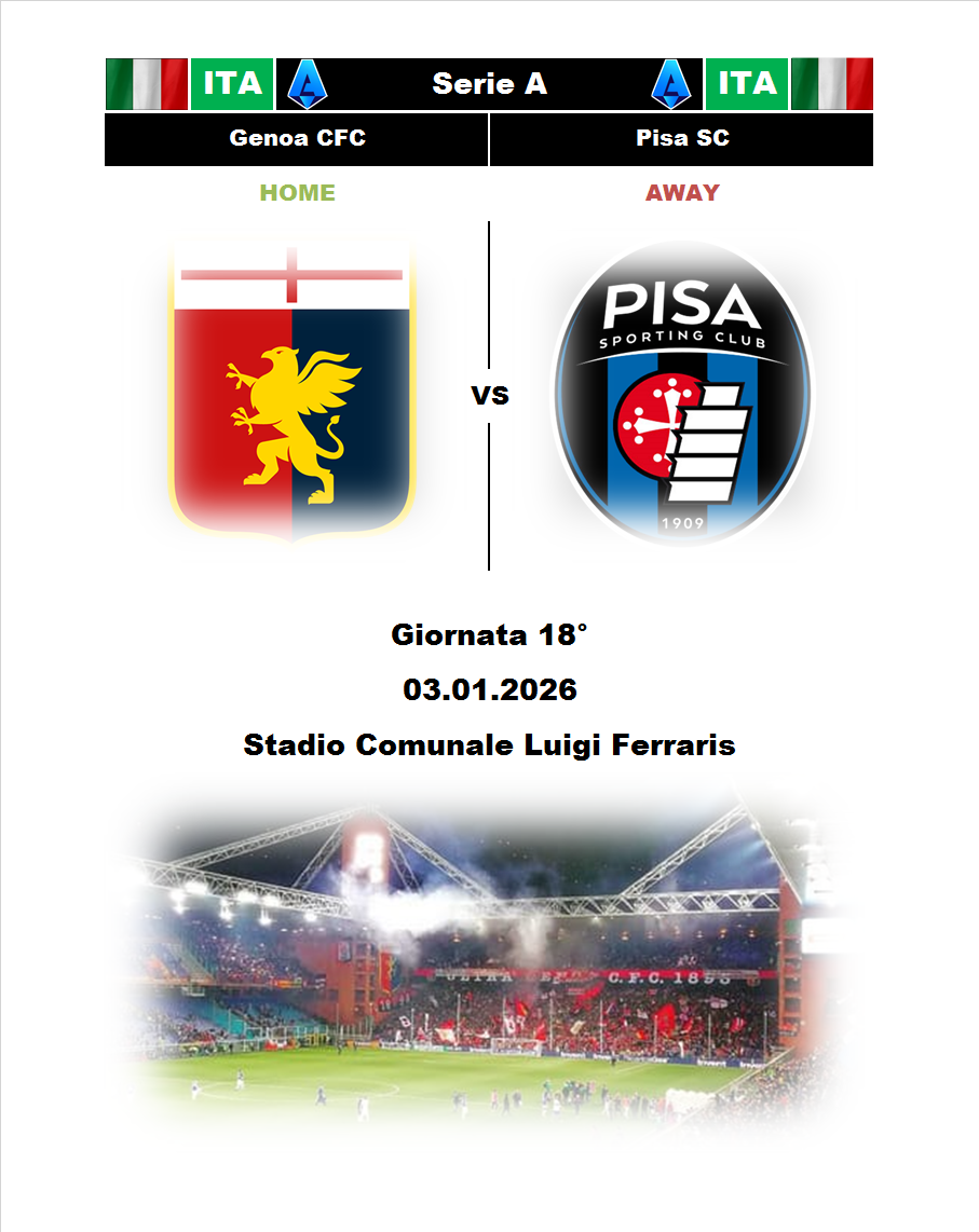 BetTop-5 опубликовано 01.01.2026 13:38 Genoa - Pisa 17:00 03.01.2026 Football Italy. Serie A. Genoa Serie A Italy Pisa 0 4