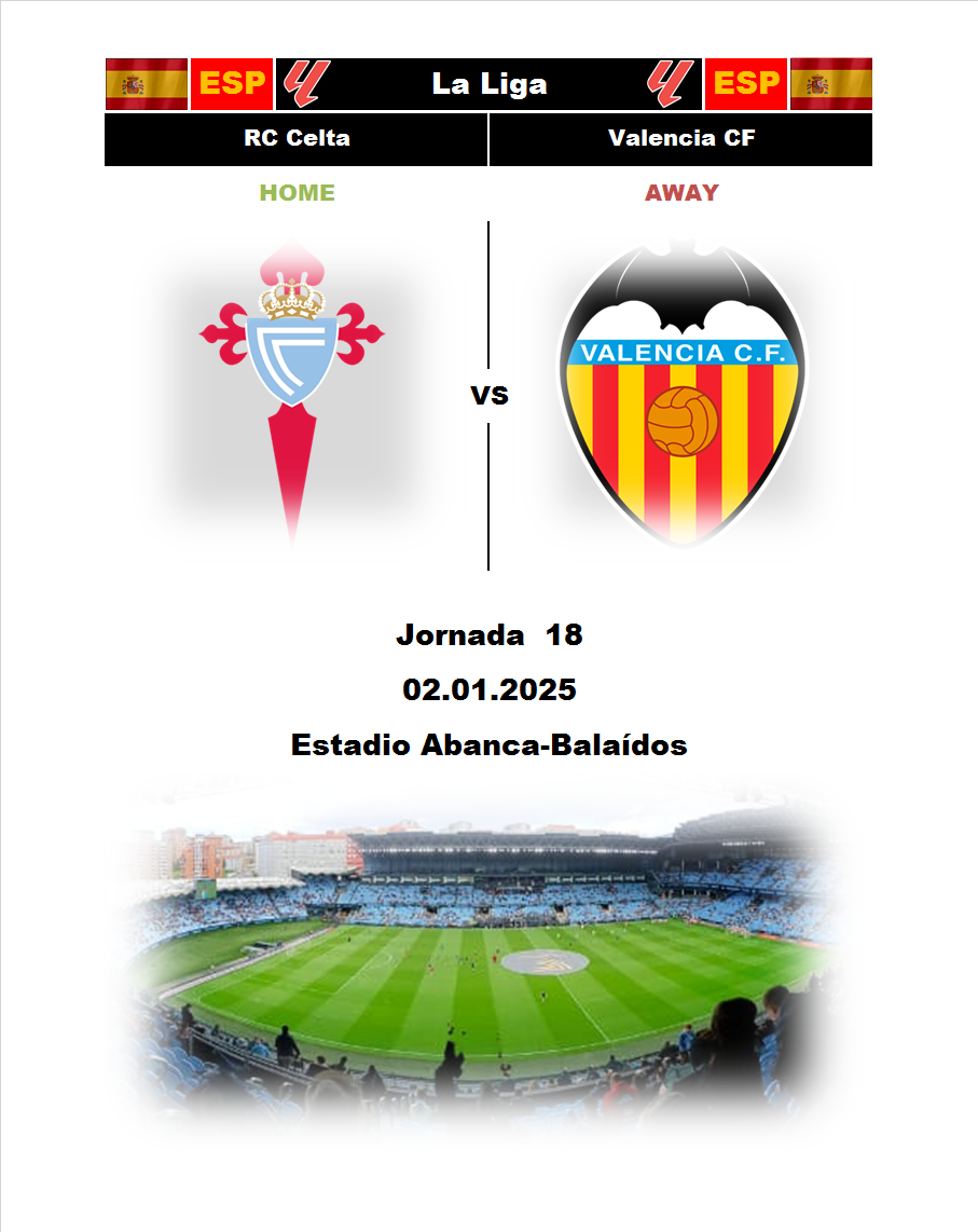 BetTop-5 опубликовано 02.01.2026 18:42 Celta Vigo - Valencia 16:00 03.01.2026 Football Spain. La Liga. Celta Vigo Valencia La Liga Spain 0 1