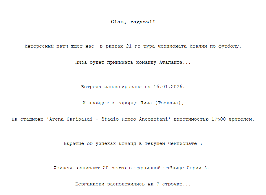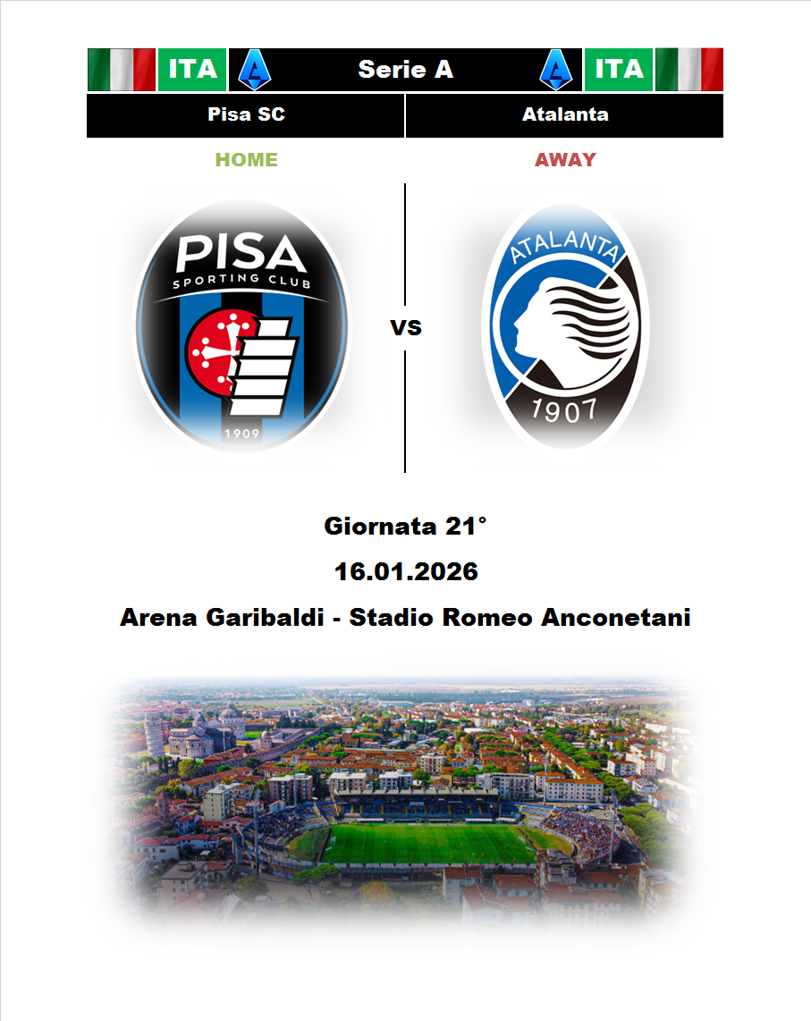 BetTop-5 опубликовано 16.01.2026 14:47 Pisa - Atalanta 22:45 16.01.2026 Football Italy. Serie A. Serie A Italy Atalanta Pisa 0 4