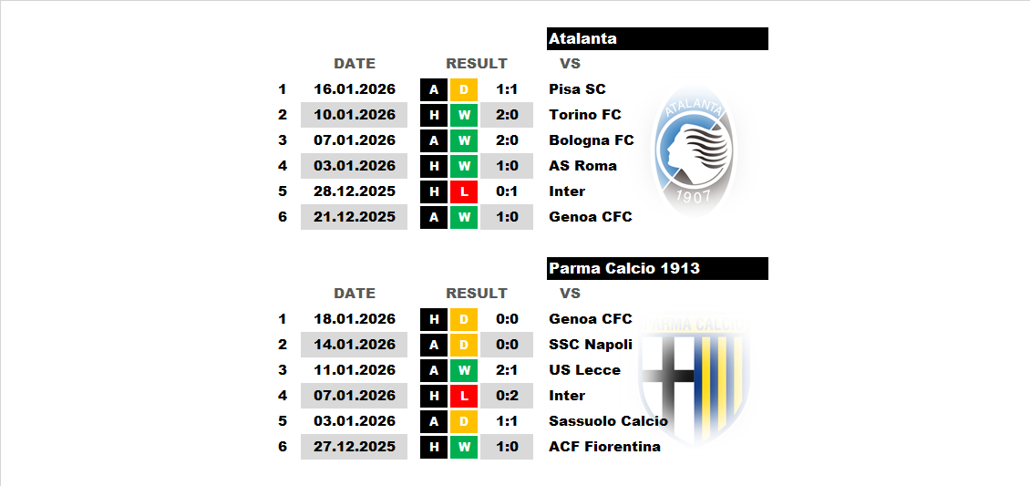 BetTop-5 опубликовано 21.01.2026 20:28 Atalanta - Parma 17:00 25.01.2026 Football Italy. Serie A. Parma Serie A Italy Atalanta 0 4