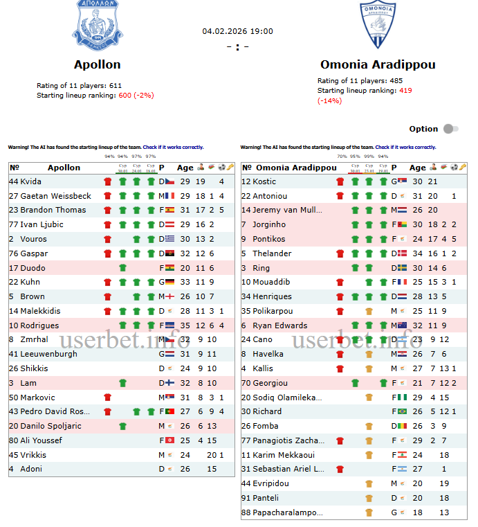 2: Критические отсутствия в атаке: У Apollon не сыграет бомбардир (наряду) Гари Родригес ( 4 гола). У Omonia Aradippou выпадают два форварда: Джорджинио (2 гола) и Понтикос (5 голов).
