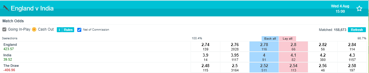 CRICKET опубликовано 02.08.2021 16:15 England v India Взял против ничьи. Погода первого дня вполне играбельна. 34 473