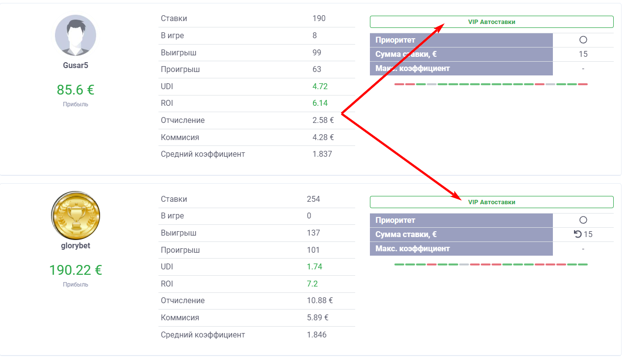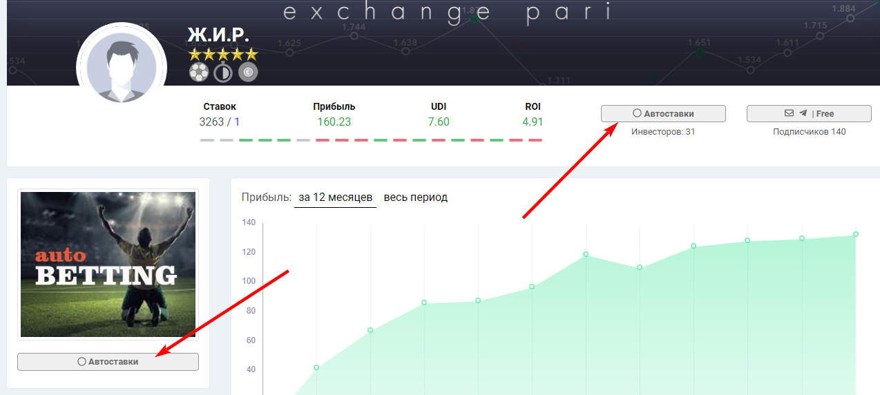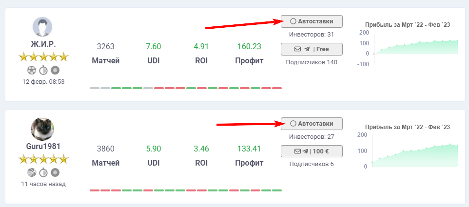 Для инвестора основным является раздел Автоставки. В данном разделе выводятся все автоставки беттеров, их результат, комиссии и отчисления.