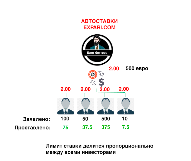На беттера могут быть подписаны несколько инвесторов и при формировании автоставки суммируется общая сумма желаемой ставки от всех инвесторов, которые подписаны на беттера. Если лимит ставки меньше чем сумма желаемой автоставки от всех инвесторов, то в таком случае размер ставки делится пропорционально от всех инвесторов.