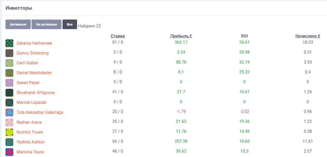 Статистику по каждому Инвестору можно отследить в разделе Инвесторы.
