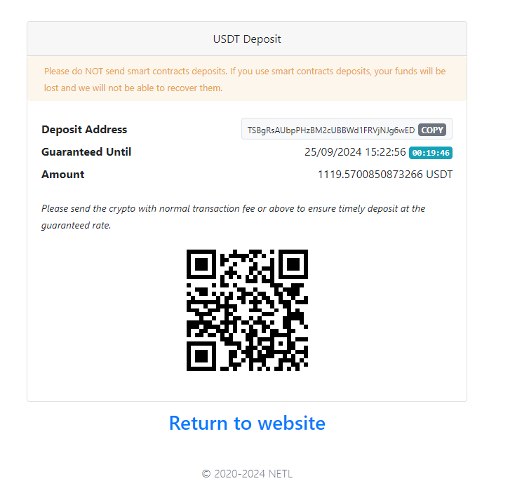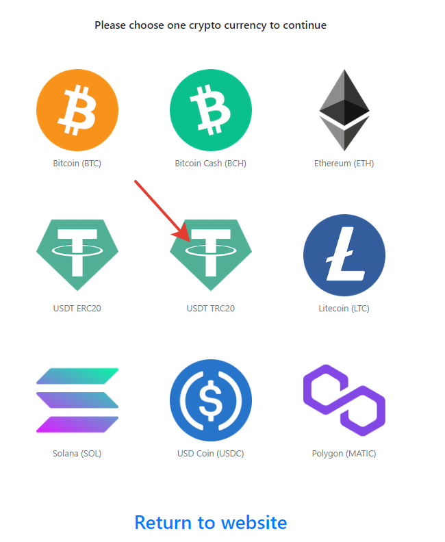 Я использую USDT TRC20, поэтому кликаю на соответствующую иконку, далее откроется страница на с адресом USDT TRC20 на который нудно перевести USDT.