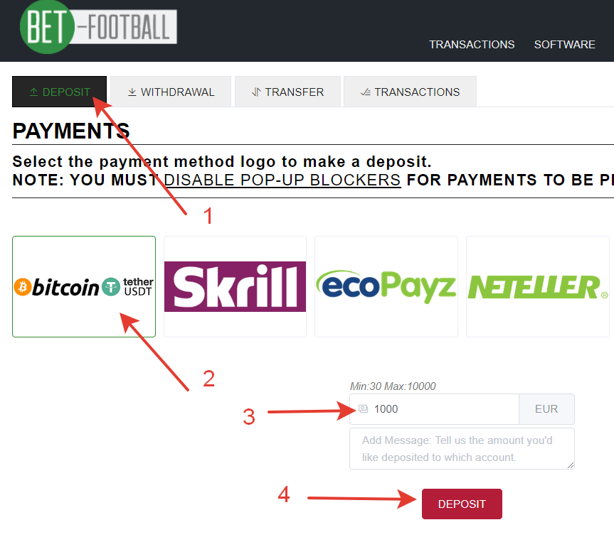 После того как вы закинули себе на криптокошелек (или на криптобиржу) USDT, можно пополнять свой счет на Bet-Football. Для этого заходим в раздел Payments , здесь выбираем: