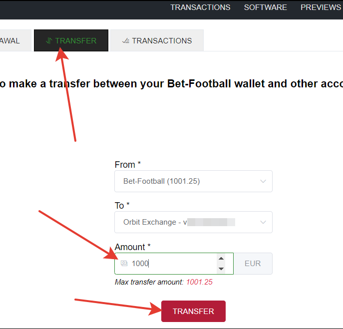 Вводим сумму которую хотим отправить с аккаунта Бет-Футбол на свой аккаунт биржи ставок Орбитекс (в моем случае 1000 евро), нажимаем на кнопку TRANSFER. Деньги моментально переведутся на ваш аккаунт на бирже ставок.