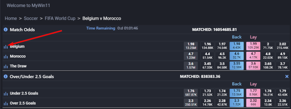 Второй сервис мониторинга графиков Betfair — mywin11.com. Данный сервис — это индийское зеркало биржи ставок Betfair. Здесь нельзя делать ставки или торговать коэффициентами, данная платформа принимает только граждан Индии. Ипользуем мы эту платформу только для просмотра графиков Betfair. Интерфейс биржи ставок понятный и привычный для трейдеров и беттеров. Графики Бетфаир можно смотреть не регистрируясь, перейдя в любой матч любого вида спорта.