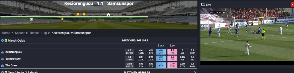 На данной бирже ставок, также можно смотреть лайв трансляции. Но предупреждаю, что задержка в трансляции составляет примерно 20 секунд, поэтому использовать трансляцию для беттига или трейдинга нужно с осторожностью.