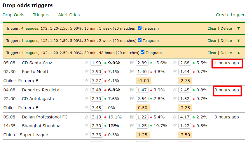 На скриншоте выше показаны три Тригера и матчи, которые попали под условия одного из Триггеров.