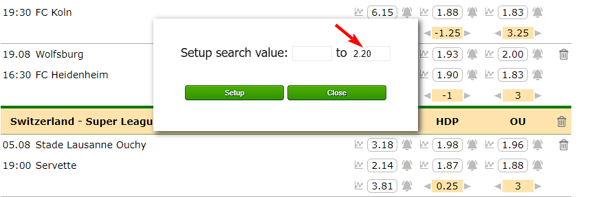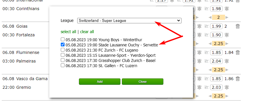 Если вы хотите задать условия по изменению коэффициента на конкретном рынке, то для этого вам нужен раздел Alert Odds. В данном разделе выбираете матчи (Add League/match), в которых хотите следить за изменением линии. Например, я хочу отследить изменение коэффициентов в чемпионате Швейцарии по команде Servette.