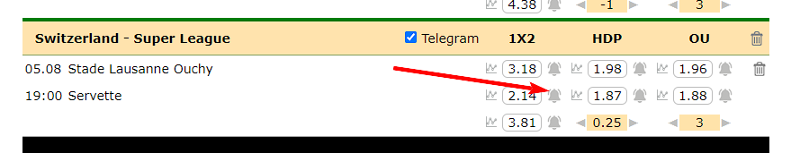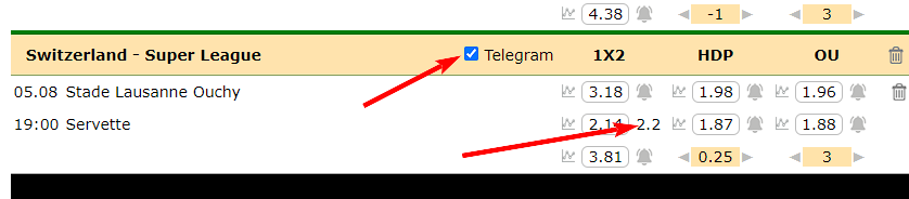 После выбора матча (матчей), можно задать порог изменения коэффициента по конкретному рынку (1х2, азиатский гандикап, тоттал). Допустим, я хочу получить оповещение в телеграм-бот если коэффициент на победу команды Servette вырастит до значения 2.20. Для этого нажимаем на колокольчик возле коэффициента за победу Servette.