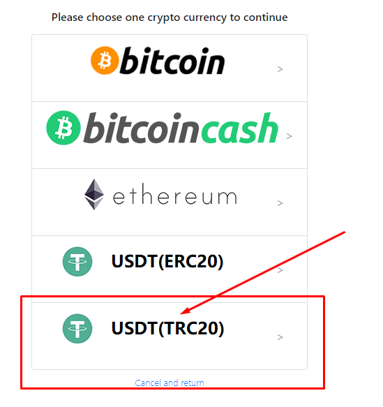 После чего, откроется новое окно, где нужно выбрать USDT TRC20