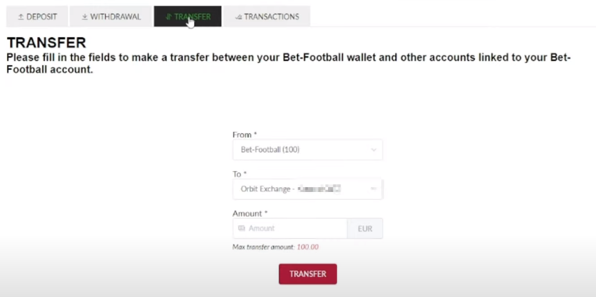 Делаем перевод из счета Бет-Футбол на счет биржи ставок Орбитекс. После нажатия кнопки Transfer средства мгновенно будут переведены на счет биржи ставок Орбитекс. После чего вы можете насладиться игрой (ставки или торговля) на бирже ставок Орбитекс.