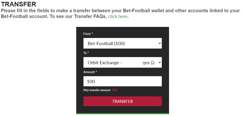 Откроется интерфейс перевода средств со счета Бет-Футбол на счет биржи ставок Орбитекс:
