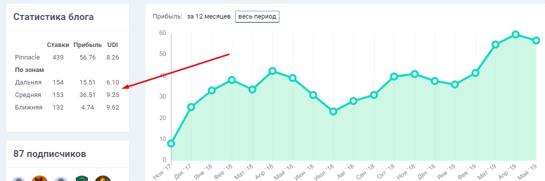 В статистике каждого блога выводится UDI по зонам “жизни” коэффициентов. “Жизнь” коэффициента профессиональные капперы делят на 3 зоны. Дальняя – от выхода линии на матч до 24 часов до начала игры. Средняя – от 24 часов до начала игры до 1 часа до начала игры. Ближняя – от появления стартовых составов до начала игры.