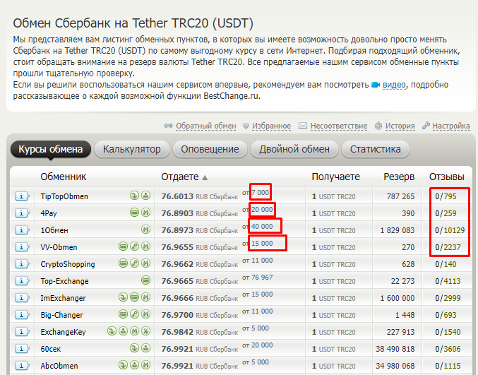 При мониторинге обменников обращайте внимание на минимальную сумму для обмена и количество отзывав по обменному пункту.