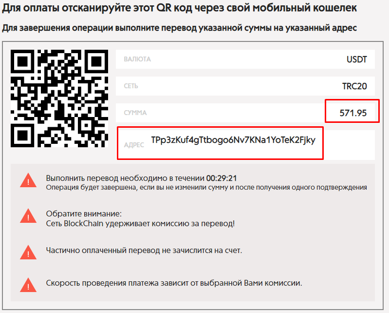 1.5 Откроется страница с реквизитами для обмена валют. Здесь представлена окончательная сумма для обмена с учетом комиссии платежного шлюза 0.5% (в данном примере указана сумма 571,95 USDT при пополнении 500 евро). Скопируйте Адрес кошелька, на который необходимо будет сделать перевод USDT TRC-20 через обменник.