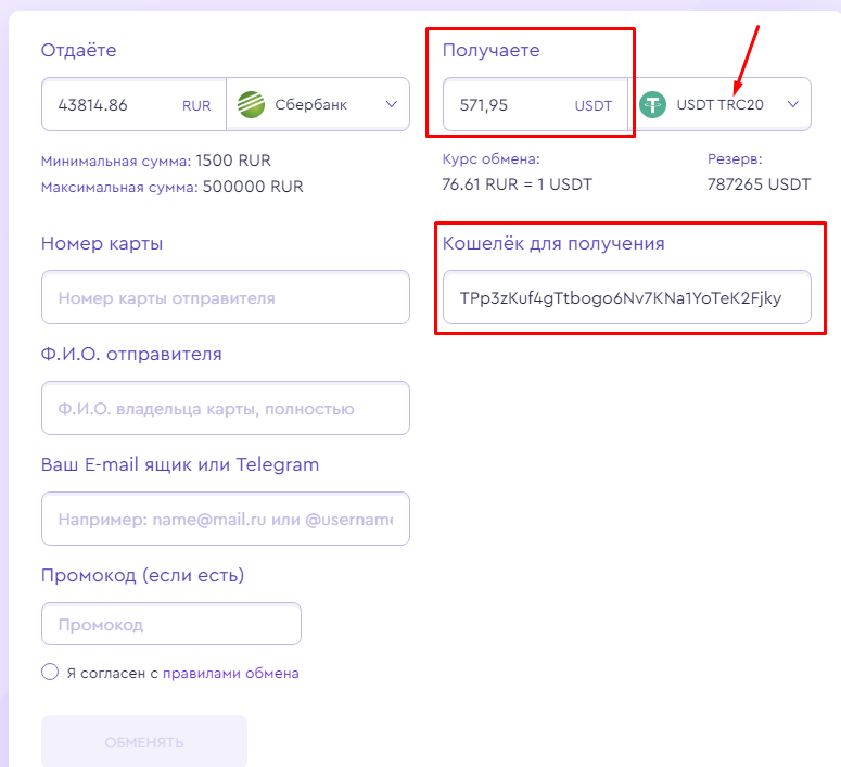 У каждого обменного пункта свой дизайн и свои условия. Выше, на скриншоте, представлен один из вариантов обменного пункта. В поле "Получите" введена точная сумма с п. 1.5 (571.95 USDT), а в поле кошелек для получения введен адрес кошелька, также с п. 1.5 данной инструкции. В поле "Номер карты", укажите номер карты с которой вы будете делать обмен (перевод), заполните все необходимы поля и нажмите кнопку "Обменять".