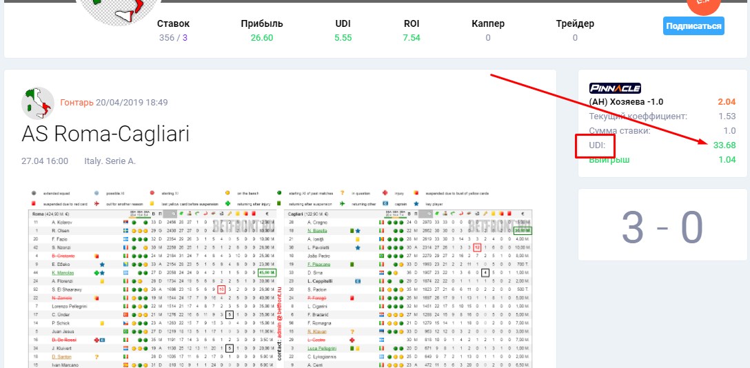 вы можете увидеть, что конечный коэффициент на фору -1 Ромы перед началом матча стал 1.53, коэффициент изменился по отношению к коэффициенту ставки аж на 33.68 %. Большинство непрофессиональных капперов сделает ставку именно на «упавший», невыгодный коэффициент, а профессиональный каппер за счет системных ставок на завышенные коэффициенты будет получать прибыль от оборота в размере UDI-маржа=ROI. Простыми словами, если ваш оборот составит 1 000 000 у.е., а ваш средний UDI-маржа = 5%, то ваша прибыль условно составит 5% от оборота 1 000 000 у.е., то есть 50 000 у.е.. Чем ниже ваш средний UDI, тем меньше ваша прибыль будет на дистанции.